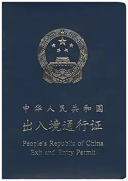 The People's Republic of China Exit and Entry Permit is a travel document issued by the National Immigration Administration of China to Chinese citizens for border trade, border tourism services, and border tourism.[1]