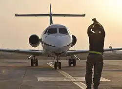 Visiting Aircraft Section (VASS) from 901 Expeditionary Air Wing marshalling a No. 32 Squadron RAF BAe 125 aircraft in the Middle East.