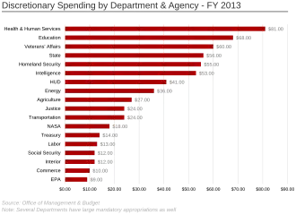 The Federal government spent approximately $600 billion during 2016 on the Cabinet departments and Agencies, excluding the Department of Defense, representing 16% of budgeted expenditures[5] or about 3.3% of GDP. The 2011 budget included estimated spending for 2010, shown in the graph at right for selected departments and agencies with over $10 billion in budget authority.