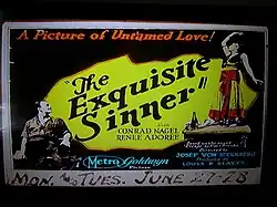 The Exquisite Sinner is a 1926 American silent drama film directed by Josef von Sternberg and adapted by Alice Duer Miller from the novel Escape by Alden Brooks. Starring Conrad Nagel and Renée Adorée, the Metro-Goldwyn-Mayer (MGM) never given a general release. No known print of the film has been recovered to date.[1] Later that same year a second feature film Heaven on Earth, directed by Phil Rosen was released with the same cast and same sets, but a different screenplay. Rosen's version performed poorly at the box office. Sternberg reported, "the result was two ineffective films instead of one.” The American Film Institute Catalog Feature Films: 1921-30 by The American Film Institute.[2][3]