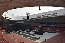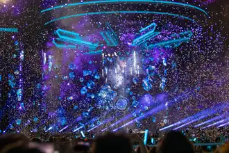The stage is equipped with more than 2,000 lights, 28 sets of LED screens totaling 2,200 square meters, 21 sets of lifting platforms, and 250 computer numerical control motors.[24] By integrating multi-tired lighting within the structure of the spaceship and flanking the movable LED screens with vertical lighting, it creates a dynamic setting for 0717's story.[16] The lighting design has been recognized by LIT Lighting Design Awards, MUSE Design Awards and Novum Design Awards.[25][26][27] The light sticks used by the audience are made of degradable and recyclable materials, in keeping with the theme of the story.[21][16]