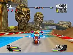 At the beginning of each round, players receive three "nitro" power-ups, which provide a temporary speed boost (these power-ups cannot be replenished). Additionally, falling off cliffs or, in some instances, the track itself results in merely losing time rather than lives; bikes are teleported back to the track and must regain their speed and recover lost time from a complete standstill.
