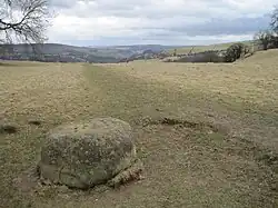 Lead mining seems to have had a continuous history in the Eyam district since at least the Roman era and there is evidence of habitation from earlier. Stone circles and earth barrows on the moors above the present village have largely been destroyed, although some remain and more are recorded. The most notable site is the Wet Withens stone circle on Eyam Moor.[8] Coins bearing the names of many emperors provide evidence of Roman lead-mining locally.[9] However, the village's name derives from Old English and is first recorded in the Domesday Book as Aium. It is a dative form of the noun ēġ ('an island') and probably refers to a patch of cultivable land amidst the moors,[10] or else to the settlement's situation between two brooks.[11]