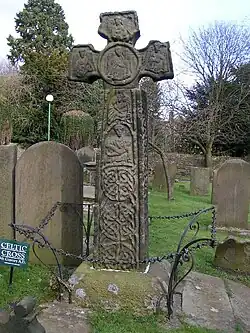 In the churchyard is an Anglo-Saxon cross in Mercian style dated to the 8th century, moved there from its original location beside a moorland cart track. Grade I listed and a Scheduled Monument,[12] it is covered in complex carvings and is almost complete, but for a missing section of the shaft.[13]