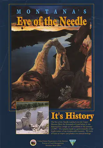 The Eye of the Needle was an 11 feet (3 m)-high naturally occurring geographic formation shaped much like an inverted "V".[1] It was located along a section of the Upper Missouri National Wild and Scenic River, on land administered by the Bureau of Land Management (BLM), approximately 56 miles (90 km) downstream from Fort Benton and adjacent to LaBarge Rock, another notable rock formation.[2] The arch was described by Meriwether Lewis in his journal during the 1805 Lewis and Clark Expedition up the Missouri River.[3]