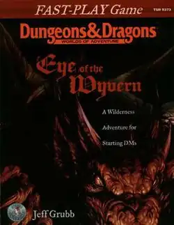 Eye of the Wyvern is a wilderness adventure, and part of TSR's Fast-Play Game adventure series. The Fast-Play products, which began with the introductory adventure "The Ruined Tower" and continued with Wrath of the Minotaur and Eye of the Wyvern, are intended to be easy to set up, run, and play, even for players new to D&D and roleplaying games.[1] Eye of the Wyvern briefly introduces the game system, with a "What is Roleplaying?" section and an introduction to the D&D concepts of character stats, character class, and race.[1]