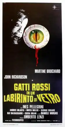 Eyeball (Italian: Gatti rossi in un labirinto di vetro, lit. 'Red Cats in a Glass Maze') is a 1975 giallo film co-written and directed by Umberto Lenzi,[3] and starring John Richardson, Martine Brochard, Ines Pellegrini, Andrés Mejuto, Mirta Miller, George Rigaud, Raf Baldassarre, Silvia Solar and Daniele Vargas. It was an international co-production between Italy and Spain, and follows a group of American tourists in Barcelona who are stalked by a killer who removes their victims' eyes.