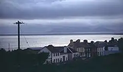 One of the most south-westerly villages in Ireland, Eyeries sits on a bluff overlooking Coulagh Bay and the mouth of the Kenmare River (actually a bay), looking towards the Atlantic Ocean, halfway along the north coast of the Beara Peninsula. It lies at the base of Maulin, which, at 2,044 feet (623 m), is the highest peak in the small Slieve Miskish mountain range.[2] The Eyeries area consists of the townland of the same name, and parts of other nearby townlands, and including the area called Eyeries Beg ("little Eyeries"). It lies near the county boundary between Cork and Kerry.[3] Access is by road, with the village lying east of Allihies and Dursey Island, southwest of Ardgroom, and north of Castletown-Berehaven (Castletownbere), the main local centre.[3] The R571 regional road passes through the area, and the village is just off it. There is a summer-only Bus Éireann service, and private bus companies also serve the area, some year-round.[4]