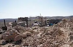 Nawi, one of several Israeli activists in the South Hebron hills[j] but according to David Shulman, the "real hero" of the area,[32] is said to have adopted the distinctive cave-dwelling Bedouin resident in this zone,[33] Eighty to a hundred members of these families, of the Bedouin al-Hathalin clan,[34] refugees from Tel Arad in the aftermath of the 1948 Arab–Israeli War, dwell at Umm al-Khair, a village south of Hebron, 30 metres from the Israeli settlement of Carmel, Har Hebron.[35] This is one of the many khirbehs of that area.[36] They eke out a rough livelihood pasturing their goats and sheep on rocky land purchased from its Palestinian owners in the early 1950s.[37] They are hardscrabble farmers of desolate hills where, according to Nawi, "nobody else would even try to grow anything," but where these Bedouin are often prevented from working the land.[3][k][l] His attachment to these people and their biblical way of life flowed, he said, from his first encounter with them. He thought their distinctive lifestyle was subject to an "existential danger" in the way their fields were burned, their grazing stock poisoned,[m][n] their wells poisoned, or demolished,[38] their aged beaten and their land expropriated.[25][o] He has been assaulted by settlers while helping Palestinians harvest olives from their own olive groves.[39] Some, fearing for their lives, would not return to their fields unless Nawi accompanied them.[40] He slept overnight in their houses to deter IDF soldiers reportedly throwing rocks at dwellings after dark.[41] He was active in many of their encampments from Bi'r al-'Id to Susia and Umm al-Kheir.[42] His arrival on the scene when settlers attacked a Bedouin family near Twamin and stole 450 head of their sheep livestock, was sufficient, according to Rabbis for Human Rights, to cause the settlers to desist and retreat.[43]