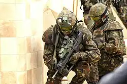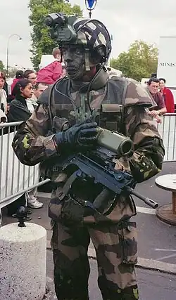 There have been many rumours about introduction of a new camouflage pattern. Demonstrators model have been disclosed sporting DPM, flecktarn and an original spot camouflage pattern showing similarities to German Flecktarn and Australian Auscam (see picture below), however latest demonstrators suggest that early Félin systems should use French standard CCE camouflage pattern. The French Army have selected the Kermel V50 and VMC40 fabrics to equip its troops within the context of the Félin Project.[4]