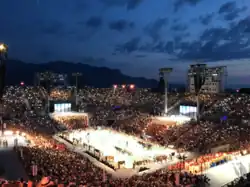 The twelfth Fête des Vignerons was held from 18 July to 11 August 2019. It was presided over by Abbot-President François Margot[27] and was directed by Daniele Finzi Pasca.[28] The music was composed by Maria Bonzanigo (musical director), Jérôme Berney and Valentin Villard, while the libretto was the work of Stéphane Blok and Blaise Hofmann.[29] The scenography was by Hugo Gargiulo,[30] Bryn Walters was the choreographer and the costumes were designed by Giovanna Buzzi. Among the approximately 6,000 actors and performers, there were nearly 1,000 singers (local choirs, choir-percussionists, children)[31] conducted by Caroline Meyer and Céline Grandjean[32] in an arena of 20,000 seats.[33] "Ranz des vaches" was performed by eleven armaillis[34] (traditional cow-herdsmen[35]), rather than a soloist as had been done since 1889.