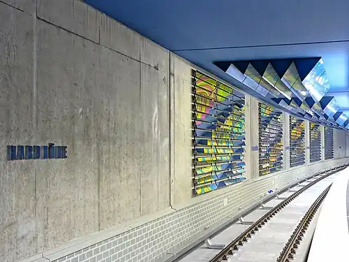 The site of the current station was used as an airfield by a local aviation related company during World War II when settlement for the most part hadn't yet reached the area. As the former airport at Nuremberg-Marienberg (opened 1933) had been destroyed in the war and the old Fürth airfield had been taken over by the American military, this so-called "Industrieflughafen" ("industrial airport") served as the primary civilian airport of the Nuremberg area from 1950 until the current airport could be opened in 1955. A small plaque in the U-Bahn station access tunnels commemorates this history.[2] The area first saw major residential construction in the period 1935-1938 which also explains some of the roads named after places in East Prussia or Silesia by the Nazi regime. After the war, the airport was an impediment to further development in the area and as soon as the new airport opened, longstanding plans to alleviate the housing shortage were put into practice in the latter 1950s to build housing in the new "Hardhöhe" neighborhood (while the name dates to medieval times, previously the housing in the area was sometimes referred to with terms harkening to the airfield). There were plans to extend the Nürnberg Fürther Straßenbahn to the area via Hardstraße and Soldnerstraße (the street layout even includes space for a - never built - balloon loop to this day)[3] but those never came to fruition before the construction of the new subway necessitated the end of all tram service in and through Fürth in 1981. As the subway kept expanding further westward, it was instead decided to connect the neighborhood to the subway instead and the new station opened in December 2007.[4][5]