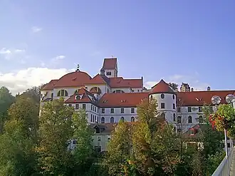 Füssen later became the site of the "Hohes Schloss" (High Castle), the former summer residence of the prince-bishops of Augsburg. Below the Hohes Schloss is the Baroque complex of the former Benedictine monastery of St. Mang, whose history goes back to the 9th century. Füssen has Saint Mang (Magnus of Füssen) as its patron saint. He and his Benedictine brother Theodor were two monks from the Abbey of Saint Gall and are considered to be its founders, in addition to the Monastery of Kempten.[3] Magnus' original burial place was in the small chapel he built. His bones were transferred to the crypt of the church built in 850. Around the year 950 all his bones disappeared.[4]