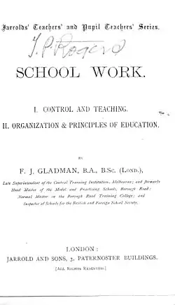 - ^ School Work Control and Teaching Organisation and Principles of Education by F. J. Gladman published Jarrold and sons 1886