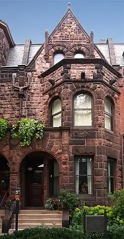 The F. Scott Fitzgerald House, also known as Summit Terrace, in Saint Paul, Minnesota, United States, is part of a group of rowhouses designed by William H. Willcox and Clarence H. Johnston Sr. The house, at 599 Summit Avenue, is listed as a National Historic Landmark for its association with author F. Scott Fitzgerald. The design of the houses was described as the "New York Style" in which each unit was given a distinctive character found in some rowhouses in eastern cities.[3] Architecture critic Larry Millett describes it as "A brownstone row house that leaves no Victorian style unaccounted for, although the general flavor is Romanesque Revival."[4] The Fitzgerald house is faced with brownstone and is two bays wide with a polygonal two-story window bay on the right, and the entrance, recessed under a round arch that is flush with the bay front, on the left. The mansard roof has a cross-gable with two round-arch windows and decorative finials.[5]