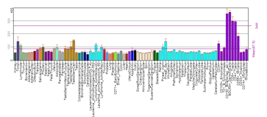 FAM214A is considered to be ubiquitously expressed (or very nearly so) in low levels according to a number of sources such as BioGPS and the Expression Atlas.[12][13][14] As can be seen in the BioGPS image below, there is a significantly higher expression level in immune-related cells and tissues, thus suggesting an immune role; however, there has been no specific in situ evidence to support this claim. Expression data has been collected from a number of studies performed on a large range of genes, therefore, some of the data is contradictory in nature.