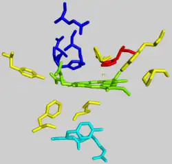 Ferrochelatase active site with protoporphyrin IX substrate in green. Residues shown are: hydrophobic groups holding protoporphyrin IX (yellow), anionic proton transfer path (dark blue), metalation residues (cyan), catalytic histidine (red).