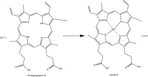 Protoporphyrin ferrochelatase (EC 4.98.1.1, formerly EC 4.99.1.1, or ferrochelatase; systematic name protoheme ferro-lyase (protoporphyrin-forming)) is an enzyme encoded by the FECH gene in humans.[1] Ferrochelatase catalyses the eighth and terminal step in the biosynthesis of heme, converting protoporphyrin IX into heme B. It catalyses the reaction: