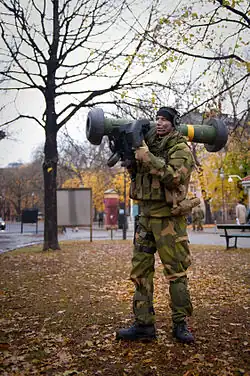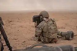In what is known as a "soft launch arrangement", the missile is ejected from the launcher to a safe distance from the operator before the main rocket motors ignite.[17] This makes it harder to identify the launcher, though backblast from the launch tube still poses a hazard to nearby personnel. The firing team may move as soon as the "fire-and-forget" missile has been launched or immediately prepare to fire on their next target.[18] The missile system is sometimes carried by two soldiers consisting of a gunner and an ammunition bearer, although one soldier can fire it. While the gunner aims and fires the missile, the ammunition bearer scans for prospective targets, watches for threats like enemy vehicles or troops and ensures that personnel and obstacles are clear of the missile's launch backblast.