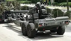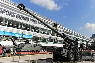 The FH-2000 or Field Howitzer 2000[2] was developed by Singapore Technologies for the Singapore Army. It is a 155 mm/52-calibre towed howitzer gun. It fires projectiles to a maximum range of 42 kilometers using special extended range ammunition, that was field tested in New Zealand. It has a crew of eight and uses a 75 hp diesel auxiliary power unit to give it a self-propelled speed of 16 kilometers an hour movement without towing.