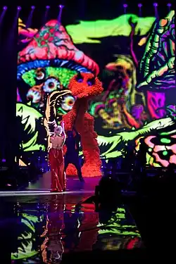 Cyrus has performed the song during her Bangerz Tour. Critics praised her performance of the song, specifically praising Cyrus' vocals and showmanship. While performing "FU" during the first leg of the tour, Cyrus wore a long red sequined skirt over a sequined red and white leotard designed by "The Blonds".[21] She also wore matching gloves and cowboy boots.[22] During the second leg of the show, she replaced the center color of the leotard from red to neon yellow and wore a long feathery yellow skirt with yellow elbow-length gloves.[21] David Blond of The Blonds stated that the pave crystal bodysuit and the rip-away sequin skirt were inspired by Jessica Rabbit.[23] A Sesame Street-esque, bi-pod puppet joined her during the performance.[24] Of her August 4, 2014 performance at the Consol Energy Center in Pittsburgh, Scott Mervis of the Pittsburgh Post-Gazette wrote that she bought the house down "with a show-stopping cabaret vocal" during "FU".[25]