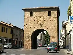 The defensive walls still partially surrounding the city, though affected by urbanization and wars, were erected during the Manfredi period between 1380 and 1470, replacing and expanding the earlier early medieval walls,[40] with a total length exceeding 5 km, including Borgo Durbecco. They were punctuated by towers (originally 35, with 26 remaining) and five large gates, of which only Porta delle Chiavi survives. In addition to the city walls, two towers were built on a fortified bridge connecting the city to the Borgo, dismantled after a 1842 flood of the Lamone River.[41]