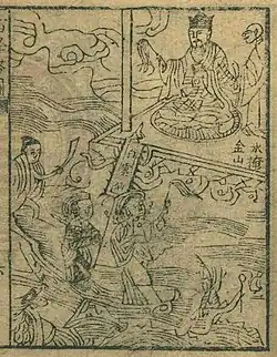 ![]() Fahai's (seated) battle against the snakes Bai Suzhen and Xiaoqing as the Jinshan Temple gets flooded. Illustration from a 1806 print of a novel based on the legend. | |