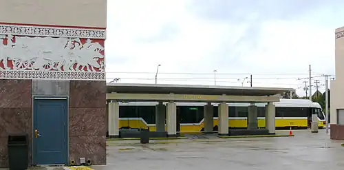 The architecture of the station's shelters is notably distinct from all other DART rail stations, boasting an Art Deco aesthetic with limestone columns and granite benches. The design, created by Brad and Diana Goldberg, is based on the ticket booths that were constructed for the 1936 Texas Centennial Exposition.[4][5] In 2010, the station (alongside fellow Green Line art piece The Traveling Man) was one of 40 projects included in the annual Public Art Year in Review by Americans for the Arts.[6][7]