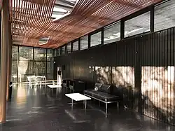 Architect Marlon Blackwell was commissioned to design the Ruth Lilly Visitors Pavilion in 2004.[7] Inspired by a fallen leaf,[30] Blackwell's design blends wood, glass, and steel with environmental sustainability systems focused on water and energy efficiency.[31] The 1,290-square-foot (120 m2) LEED-certified building is situated within the park's northeastern woods, containing a multipurpose room and restrooms.[30] The pavilion has earned accolades from the American Institute of Architects (AIA), Architect Magazine, and Chicago Athenaeum, among others.[32] In 2021, a six-person panel of AIA Indianapolis members identified the pavilion among the ten most "architecturally significant" buildings completed in the city since World War II.[33]