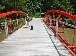 Waller Bridge, a bowstring pony truss footbridge spanning the Indiana Central Canal, allows pedestrians to travel between the park and the rest of the Newfields campus. The bridge was originally located in Montgomery County, Indiana, constructed by the King Bridge Company in 1873. The bridge was later moved to its current site and restored with some contemporary modifications.[3][29]