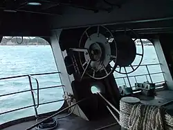 A fairlead is a turning point for running rigging like rope, chain, wire or line, that guides that line such that the "lead" is "fair", and therefore low friction and low chafe.[1] A fairlead can be a hook, ring, pulley, chock, or hawse (hole) sometimes surrounded by rollers.