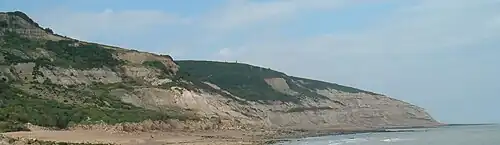 The beach can also be reached from Firehills, a coastguard station and viewpoint, with parking for visitors to the park. From here it is a steep 20 minute walk downhill west along the coast path.[5]