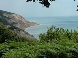 The 100 ft (30 m) high cliffs are sandstone and clay which is subject to erosion. Access to the beach was officially closed when the original wooden steps leading down from the coast path were swept away in a landslip. Alternative steps have been cut into the path by users; as of June 2021 [5] the path was safe to walk, but the visitor should be prepared for a bit of a climb Anyone contemplating swimming should be aware of hidden rocks and the absence of lifeguards or normal rescue services. Occasionally people have been rescued by helicopter from the beach or cliffs.
