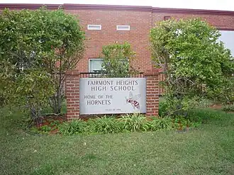 The school was originally named after the nearby town of Fairmount Heights. The name of the school differs slightly from the name of the town, as it is missing a "u". This is because of a mistake a contractor made when constructing the sign for the town's elementary school in 1934. When the high school was created, it kept the same spelling as the elementary school.[6] According to Leon Wynter of The Washington Post, during the time the school was de jure segregated and during the first four years of post-formal desegregation, until the federal government asked PGCPS to change the attendance boundaries in 1969, "Fairmont Heights thrived in separate but equal isolation for 19 years, developing strong roots in the neighborhoods of Fairmont Heights, Capitol Heights and Beaver Heights."[4] In the era of legally required segregation it served black students in western Prince George's County, Accokeek, Bowie, Laurel, Takoma Park, and other communities;[3] this meant it served about 66% of the PGCPS black high school students.[4]