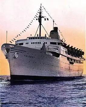 The Turbine Steamship Fairsky was a one-class Italian-styled passenger ship operated by the Sitmar Line, best known for service on the migrant passenger route from Britain to Australia from May 1958 until February 1972. After a 20-month lay-up at Southampton, Fairsky completed two further voyages to Australia, before returning to be based at Sydney as a popular full-time cruise ship, until striking an unmarked wreck in 1977 which rendered the vessel uneconomic to permanently repair. The ship was finally sold to a Philippines based consortium, intended for static use as a casino and floating hotel. In 1979 during refurbishment at Manila Bay for her new role, a fire broke out onboard which destroyed the accommodation. The wreck was towed to Hong Kong for demolition in 1980.