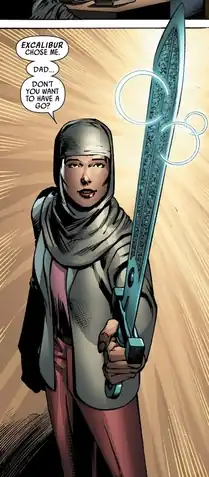 After the defeat of the Skrulls, Faiza Hussain became the wielder of Excalibur,[8] and joined MI:13 as Black Knight's steward.[9] When Dracula attacked the United Kingdom he personally attacked Faiza's family, injuring her mother while kidnapping her father and sending forces to attack the members of MI:13. In the aftermath of the attack, Pete Wisdom deduced that attack's aim was to keep Faiza (and Excalibur) out of the battle. He gives Faiza the codename "Excalibur" because he wants Dracula and his forces to hear and know that the mythical blade is still an active part of MI:13.[3]