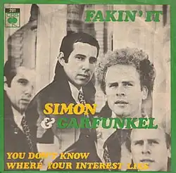 "Fakin' It" was issued as a single that summer and found only modest success on AM radio; the duo were much more focused on the rising FM format, which played album cuts and treated their music with respect.[10] The running time of the song was actually 3 minutes and 14 seconds. Radio stations at the time resisted playing songs lasting longer than three minutes, so Paul Simon had the time "faked" to read 2:74 on the label. Simon preferred the album version of "Fakin' It" to its single release. He felt the stereo remix "greatly improved" the original mix, which he considered to be "sloppy."[9] On the other hand, Billboard particularly praised the production of the single version.[11]