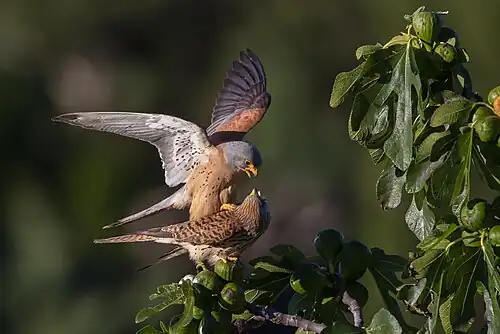 The lesser kestrel eats insects, but also small birds, reptiles and rodents (especially mice),[9] which are often taken on the ground. It nests colonially on buildings, cliffs, or in tree holes, laying up to 3–6 eggs. No nest structure is built, which is typical for falcons. On their wintering grounds in West Africa, lesser kestrels favour a "latitude belt"[10] through Senegal where locusts and grasshoppers are plentiful. Surveys of lesser kestrels wintering in January 2007 by the Ligue pour la Protection des Oiseaux revealed them roosting communally. A roost in Senegal discovered during one of the surveys held 28,600 birds, together with 16,000 scissor-tailed kites Chelictinia riocourii.[11]