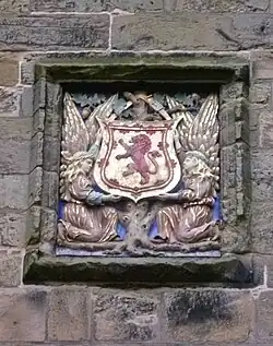 After the Union of the Crowns in 1603, Andrew Murray of Balvaird kept a watchful eye on the palace and in 1615 he advised John Murray of the bedchamber that the king should send a commission for repairs, because otherwise "it will not fail to fall all to the ground. The back galleries are already decayed".[123] The architect James Murray repaired the palace for the visit of King James in 1617.[124] Some courtiers were lodged in the house of Nicol Moncrieff, which still stands in Falkland, opposite the palace gate.[125] At the celebrations to welcome the king on 19 May, David Wedderburn provided a Latin poem, in which the King, after a day of hunting, was asked to contemplate the memorials of Scotland's past, victories over the Romans and Vikings, the wars of Scottish Independence, and the present union of the kingdoms of Britain.[126]