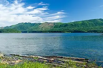 Winberry Creek Road runs along the Winberry arm and meets Lowell–Unity Road (Lowell–Jasper Road) near the covered bridge. Big Fall Creek Road and Peninsula Road branch off Winberry Creek Road and, along opposite shores, follow the Fall Creek arm upstream to the end of the lake. Each road leads to one or more of the many day-use sites and campgrounds around the lake. Forest Road 18 begins at the head of the lake and follows Fall Creek upstream for many miles to other campgrounds and hiking trails in the Cascade Range.[6]