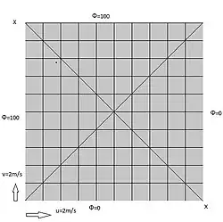 In figure 1, u = 2 and v = 2 m/s everywhere so the velocity field is uniform and perpendicular to the diagonal (XX). The boundary conditions for temperature on north and west wall is 100 ̊C and for east and south wall is 0 ̊C. This region is meshed into 10×10 equal grids. Take two cases, (i) with diffusion coefficient ≠ 0 and, case (ii) with diffusion coefficient = 0.
