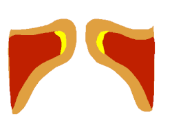 The folds are made up of elastic and fatty tissue. The folds are covered on the surface by laryngeal mucous membrane, which is supported deeper down underneath by the innermost fibres of the thyroarytenoid muscle. In falsetto, the extreme membranous edges (i.e., the edges furthest away from the middle of the gap between the folds) appear to be the only parts vibrating. The mass corresponding to the innermost part of the thyroarytenoid muscle remains still and motionless.[1]