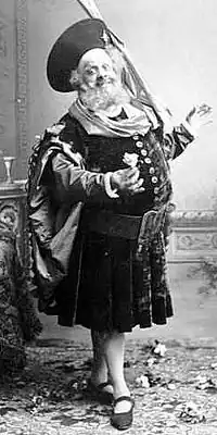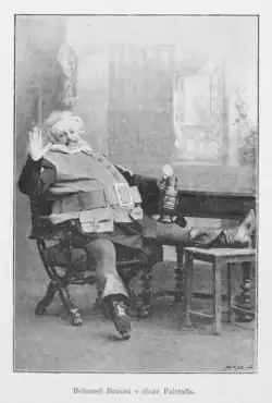 The first performances outside the Kingdom of Italy were in Trieste and Vienna, in May 1893.[41] The work was given in the Americas and across Europe. The Berlin premiere of 1893 so excited Ferruccio Busoni that he drafted a letter to Verdi, in which he addressed him as "Italy's leading composer" and "one of the noblest persons of our time", and in which he explained that "Falstaff provoked in me such a revolution of spirit that I can ... date [to the experience] the beginning of a new epoch in my artistic life."[42] Antonio Scotti played the title role in Buenos Aires in July 1893; Gustav Mahler conducted the opera in Hamburg in January 1894; a Russian translation was presented in St Petersburg in the same month.[43] Paris was regarded by many as the operatic capital of Europe, and for the production there in April 1894 Boito, who was fluent in French, made his own translation with the help of the Parisian poet Paul Solanges.[43] This translation, approved by Verdi, is quite free in its rendering of Boito's original Italian text. Boito was content to delegate the English and German translations to William Beatty-Kingston and Max Kalbeck respectively.[43] The London premiere, sung in Italian, was at Covent Garden on 19 May 1894. The conductor was Luigi Mancinelli, and Zilli and Pini Corsi repeated their original roles. Falstaff was sung by Arturo Pessina; Maurel played the role at Covent Garden the following season.[44] On 4 February 1895 the work was first presented at the Metropolitan Opera, New York;[45] Mancinelli conducted and the cast included Maurel as Falstaff, Emma Eames as Alice, Zélie de Lussan as Nannetta and Sofia Scalchi as Mistress Quickly.[46]