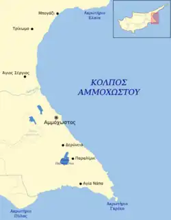 Famagusta Bay (Greek: Κόλπος της Αμμοχώστου, Turkish: Mağusa Körfezi) is the easternmost body of water that is formed by the Karpasia peninsula and Protaras. It is named after the city of Famagusta, which lies almost right in the middle of the bay. The ancient city-state of Salamis also is found on the bay, north of Famagusta. It is known for the best sandy beaches in Cyprus, which stretch for miles.
