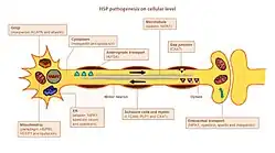 HSP is caused by defects in transport of proteins, structural proteins, cell-maintaining proteins, lipids, and other substances through the cell. Long nerve fibers (axons) are affected because long distances make nerve cells particularly sensitive to defects in these mentioned mechanisms.[3][4]