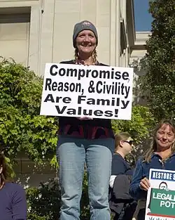 Other liberals have used the phrase to support such values as family planning, affordable child-care, and maternity leave.[44] For example, groups such as People For the American Way, Planned Parenthood, and Parents and Friends of Lesbians and Gays have attempted to define the concept in a way that promotes the acceptance of single-parent families, same-sex monogamous relationships and marriage. This understanding of family values does not promote conservative morality, instead focusing on encouraging and supporting alternative family structures, access to contraception and abortion, increasing the minimum wage, sex education, childcare, and parent-friendly employment laws, which provide for maternity leave and leave for medical emergencies involving children.[45]