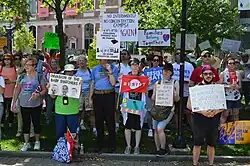 At some of the locations there were counter protesters, resulting in at least one arrest. A counter-protester was arrested at Huntsville, Alabama after displaying a gun, and reportedly stating "I will shoot everyone here."[18] In Phoenix, Arizona, about 25 counter-protesters from patriot movement proclaimed their opposition to the protests using signs and a megaphone, and engaging others at the protests near Arizona State Capitol, while the event remained mostly peaceful.[19]