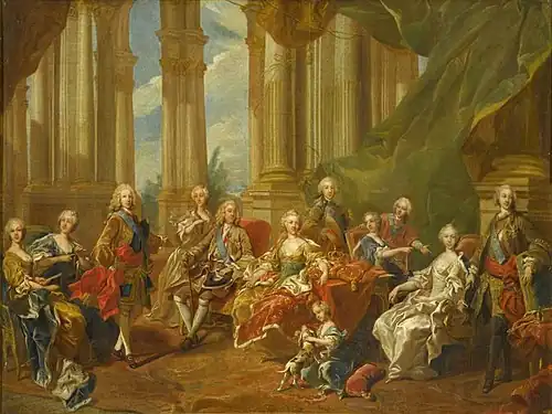 The Family of Philip V is an oil-on-canvas painting by the French artist Louis-Michel van Loo, completed in 1743.[1] It features life-sized depictions of Philip V of Spain and his family. The painting depicts the royal family in a fictional room and is in the style of French baroque and rococo art.[1] The painting is one of a trio of paintings which bear the same name and are dated 1723 by Jean Ranc, a smaller 1738 version and the 1743 rendition.[2]