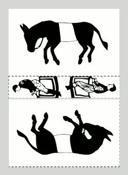 The printed card of the puzzle shows two donkeys, the central part of which has been left blank on purpose. The third part of the card are the riders, and the objective of the puzzle is to arrange the three pieces (the two donkeys and the riders) so the riders are mounted on the donkeys' backs.
