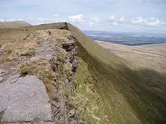 Fan Hir is a peak at the eastern end of the Black Mountain (Y Mynydd Du) in the Brecon Beacons National Park (Parc Cenedlaethol Bannau Brycheiniog) in southern Wales. It is a subsidiary summit of Fan Brycheiniog. It falls within the county of Powys and is also a part of the traditional area of Fforest Fawr. Its Welsh name means "long peak", a fitting description, particularly if seen from the east when its steep eastern face is seen to advantage. It is about 2.5 miles or 4 km long and faces east. Its summit is 2490 feet (about 760m) above sea level. Fan Hir is separated from its higher neighbour to the north-west, Fan Brycheiniog (2633 feet or 802 metres) by a col known as Bwlch Giedd, where a path rises from Llyn y Fan Fawr via a stone staircase.[1]